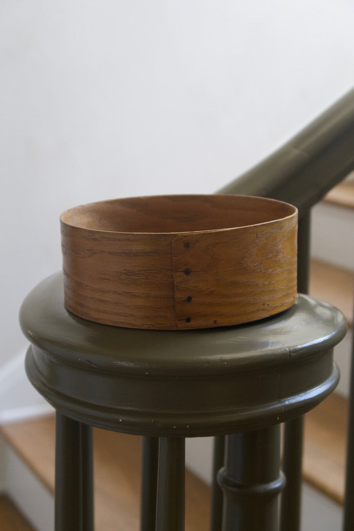 Round wooden pantry box with a honey-toned finish and visible nail joinery. A classic Americana form, perfect for layering on shelves or kitchen display.