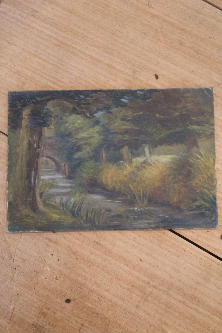 Vintage oil on board depicting a shaded woodland stream with lush greenery and a small arched bridge. Rich tones and expressive brushwork make this piece ideal for layered, collected interiors.